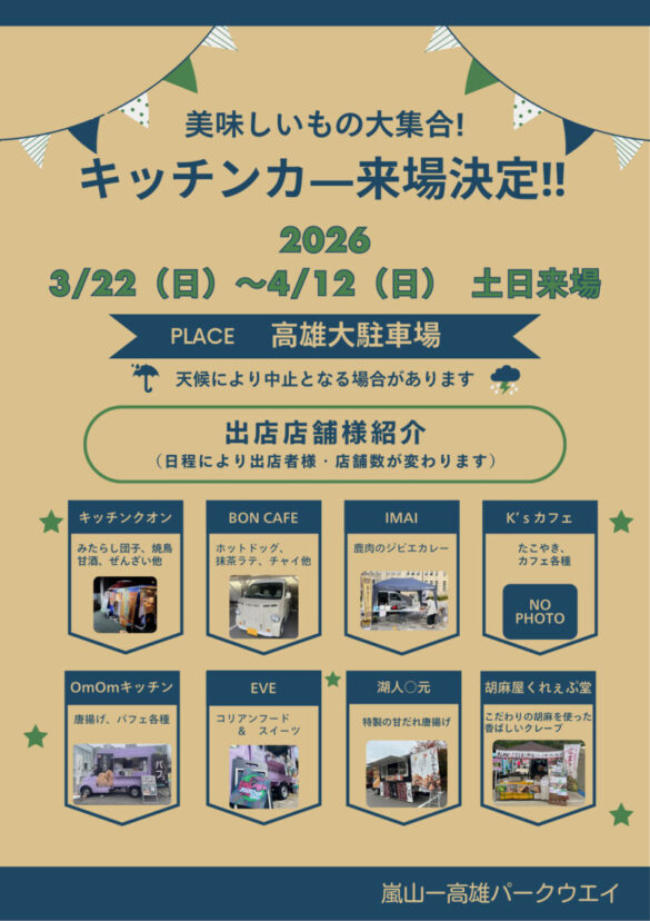 3月22日(日)~4月12日(日)の土日は、高雄駐車場にキッチンカ―が来場します。