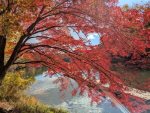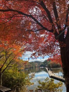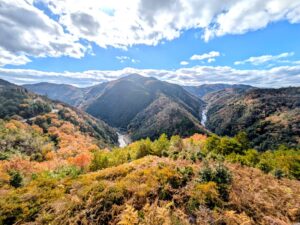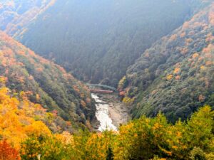 本日11/29の紅葉は落葉しているところもございますが、保津峡展望台から見る山々は大変綺麗に色づいてきております。