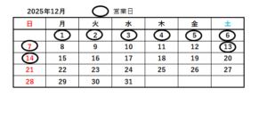 営業日・・12月1日(月)~7日(日)毎日営業、13日(土)14日(日)