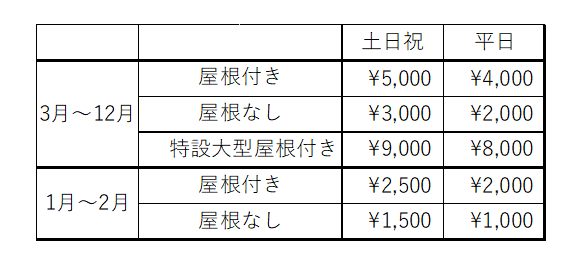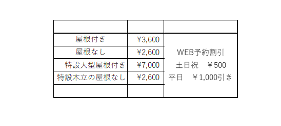 ※特設大型屋根付きは季節限定とさせていただきます。また、特設木立のバーベキュー屋根なし(季節限定)は終了させていただきます。
